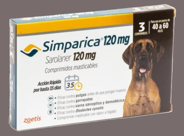 Simparica 120 mg es un antiparasitario masticable para perros de 40 a 60 kg. Indicado para el tratamiento de: